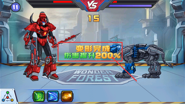 3、战斗中触发【变形完成】后,机甲【伤害提升200%】,此时集中释放技能,可快速压低对手血量,扩大对战优势。
