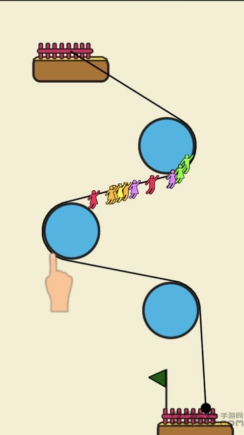 把绳索分别绕过最左侧和最右侧的蓝色方块,再把它固定到橙色区域里。等巨轮行驶到方块附近时,点击屏幕让小人滑下去,只要数量超过20个就行。
