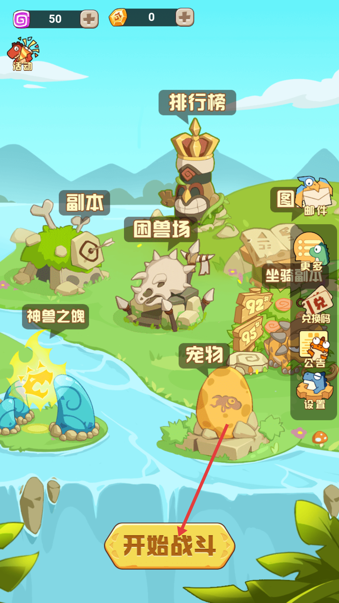 1、点击【开始战斗】按钮进入游戏界面后,就能参与副本、困兽场等多种玩法,开启充满刺激的史前战斗之旅。