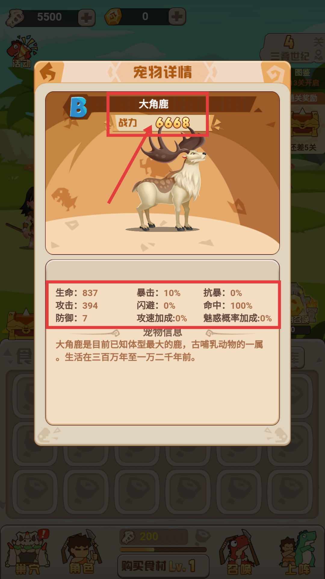 3、查看【大角鹿-战力6668】的宠物详情,了解其生命837、攻击394等属性,为宠物培养做规划。