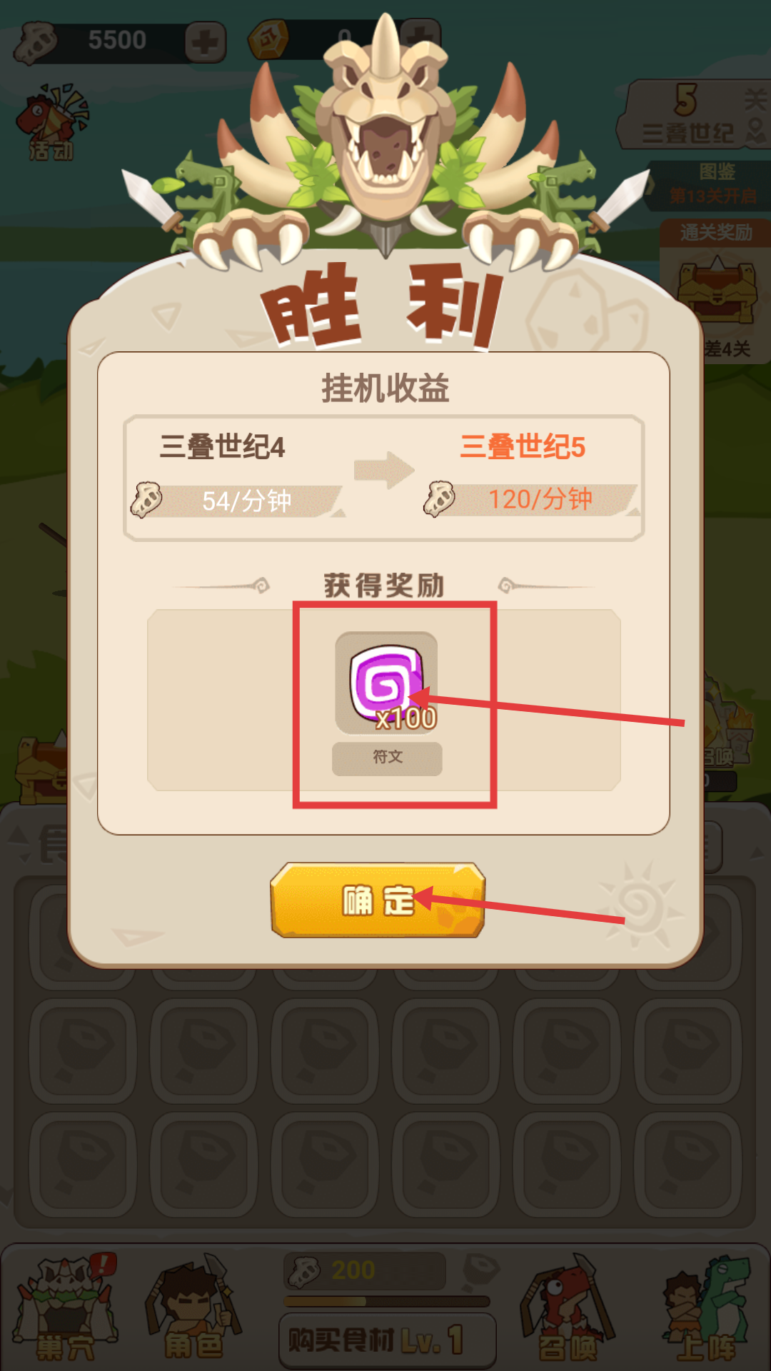 4、战斗胜利后,可获得【符文-x100】的奖励,点击【确定】按钮即可领取,领取后能提升挂机收益,同时解锁三叠世纪5关卡。