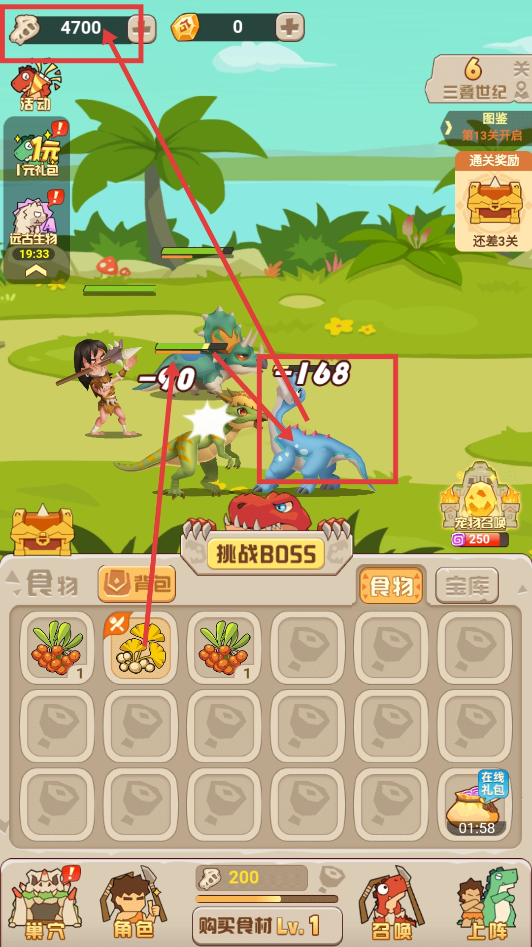 1、拥有【4900-资源】时,购买食材,提升恐龙战力,为挑战BOSS和战斗做好准备。