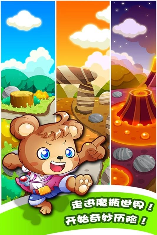这是一部能陪伴孩子成长的游戏,孩子们的好朋友以及众多知名动漫形象都会在游戏中登场。你可以和米米熊、小小熊、眼睛熊、黑熊波波等角色伙伴一起,在奇妙的魔瓶世界里展开探险,通过一系列精彩的冒险打败大魔王,最终拯救世界。