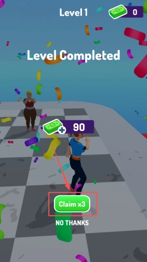 4、通关领奖:当界面显示“Level1 - Level Completed 90”时,点击“Claimx3”即可领取三倍奖励。