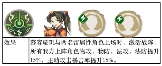 不过,夏侯阵法有个明显的缺点,如图所示对单体伤害缺乏加成,在对单体攻坚时难免吃亏。好在队伍中的慕容璇玑同样拥有阵法,而且是同样优秀的雷阵。因此在夏侯阵基础是,阵容构建引入雷阵,可以在面对不同类型关卡时灵活切换阵法。当然也可以多养几队人马,不同图不同人。