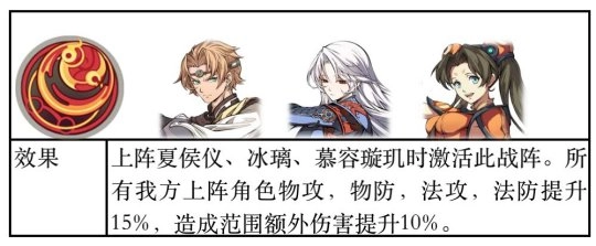 夏侯阵法虽然条件苛刻(固定三人)但是优秀的范围伤加成配合3个强力输出角色,即使三测被削弱了范围伤害减伤,依旧是一个非常强力的阵法。