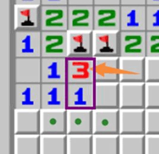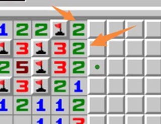 橙色箭头指向的数字3,由于其周边已有1个雷是通过其他途径确定的,所以这个3的实际代表数字是2。