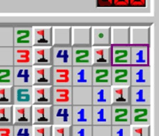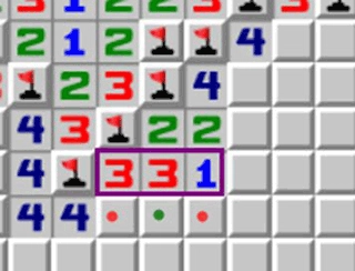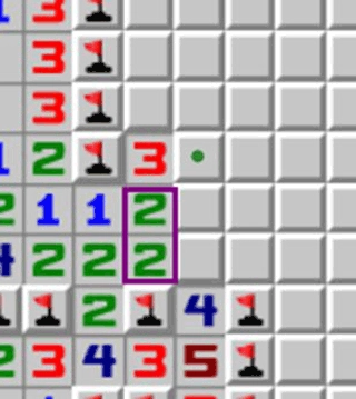 橙色箭头指向的数字2,其周围已经通过其他途径确定存在1个地雷,所以这个位置的实际有效数字应为1,此时能够运用121定式来进行判断。