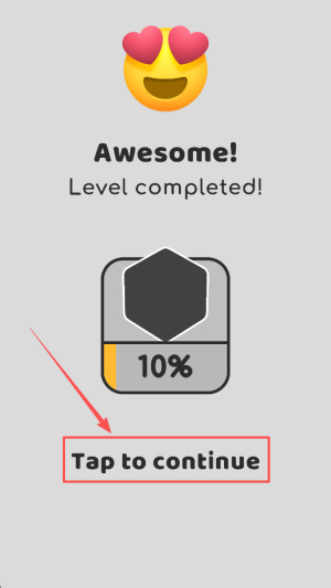 3、完成关卡:在显示“Awesome! Level completed! 10%”的界面中,点击“Tap to continue”按钮。