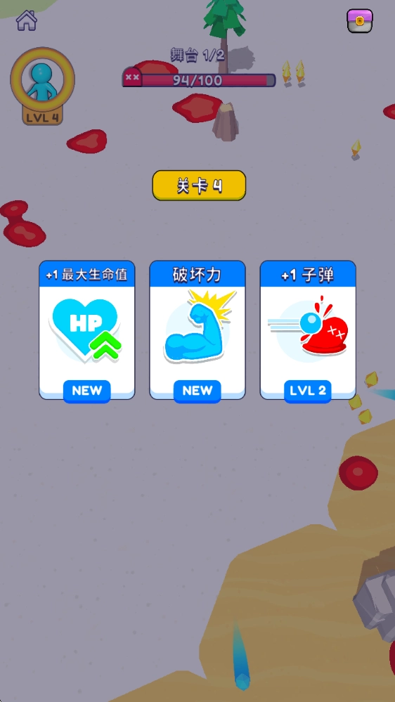 消灭敌人后能够获取经验值,以此提升自身等级。每次升级时,你可以从三张强化卡牌里挑选一张来获得。