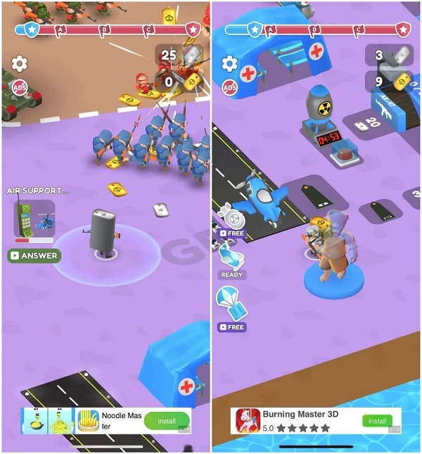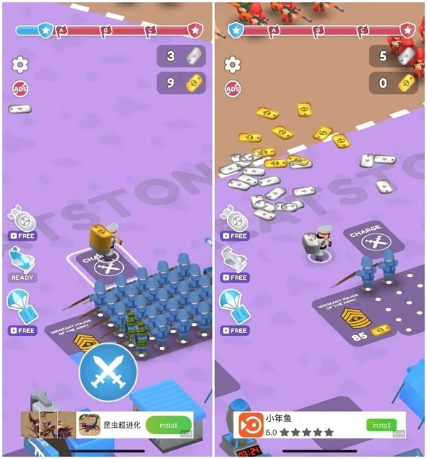 陆军指挥官,也叫Army Commander,是海外团队Lion Studios推出的一款策略休闲游戏。说到这儿,不少玩家可能会好奇:休闲和策略这两种元素是如何结合的呢?其实只要你亲自进入游戏体验一番就能明白。游戏画面一开始就给人整洁清爽的感觉,角色造型是满满的欧美3D卡通风格,二头身的美国大兵形象呆萌又好笑。而完善的美国军衔体系,还为这款看似简单的游戏增添了严谨的体验感。