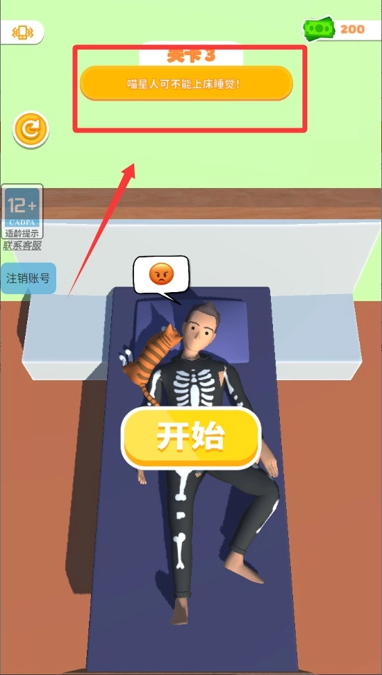 点击屏幕正中间那个橙色的“开始”按钮就能进入游戏啦,这个按钮有呼吸灯的效果,点击之后会响起“叮”的一声音效,同时加载第一关的场景。