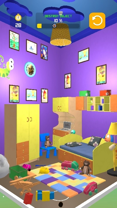 玩家的核心目标就是对房屋进行破坏,使房屋呈现出杂乱无章的状态,任何入眼觉得不满意的地方,都可以尽情砸毁!