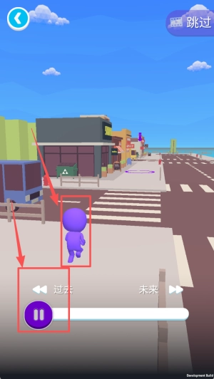 启动后,操控紫色小人向前移动,借助底部进度条的箭头切换过去与未来状态,遇到复杂路段时可点击右上角的跳过按钮加速。