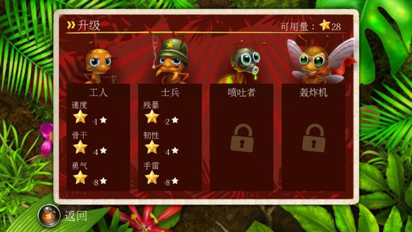 游戏里有工人、士兵、喷吐者和轰炸机这四种蚂蚁类型,通关后能得到星星奖励,这些星星可以用来增强各类蚂蚁的能力和属性。
