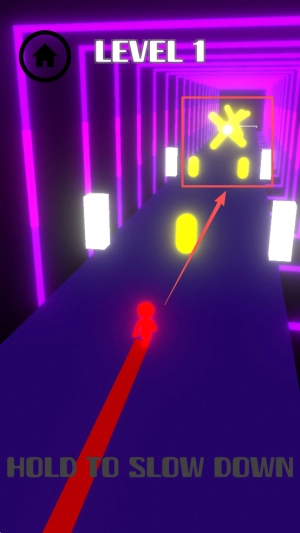 然后,按住屏幕上的任意一处来启动“HOLD TO SLOW DOWN”机制,借此精准调控角色的下落速度,从而避开障碍物。