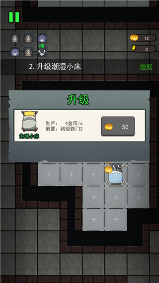 游戏开始先攒钱升级床铺,第一波25块钱的时候一定要升级床,攒够16块钱就把2级门升一下。