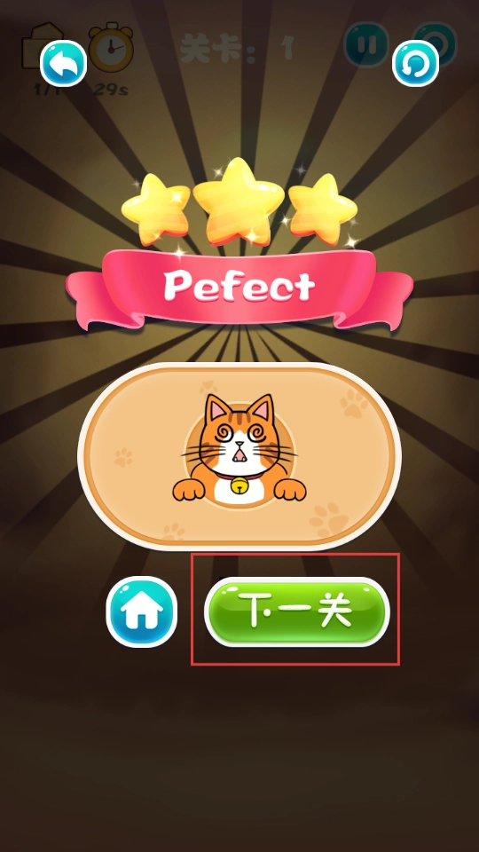 成功引导猫咪到达指定区域后,页面会显示三星评价,点击下一关,即可开启新场景的猫咪引导挑战。