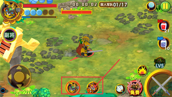 2、战斗时留意敌人军队-01/17进度,点击副将图标召唤副将协助作战,用方向控件调整位置,借助HP-21与MP-10道具续航。