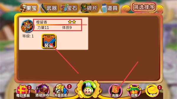 1、在果宝界面,关注【橙留香】-等级1的力量11-体质9属性,点击装备按钮为其配置装备,同时利用每日奖品-活动中心等入口获取资源。