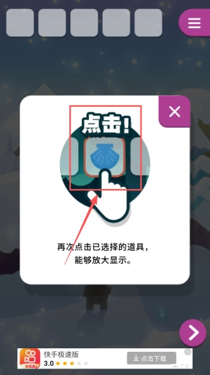 接下来,要学习如何操作道具,按照屏幕提示点击“点击”按钮来进行学习。