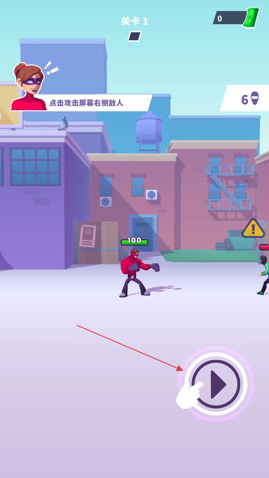 打开佳作后,进入关卡1,按照提示点击屏幕右侧的攻击按钮,向右侧的敌人发起攻击,开启战斗之旅。