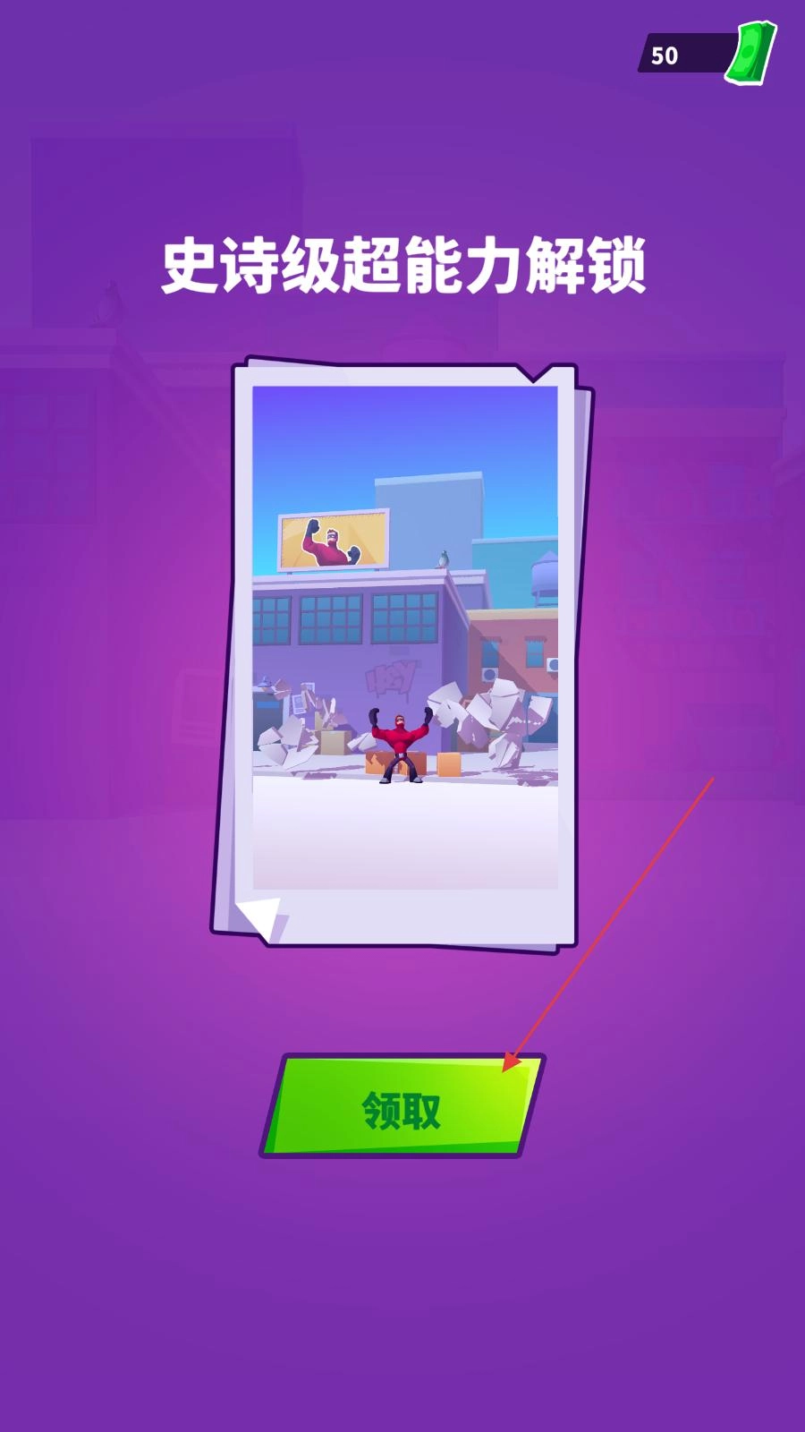 完成关卡战斗后,会弹出史诗级超能力解锁界面,点击领取按钮,即可获取新解锁的超能力,从而增强角色战斗力。