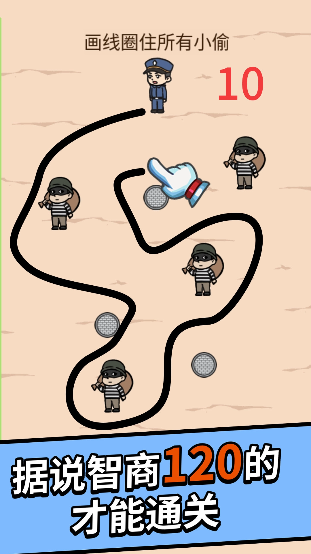 1、在“抓住小偷”这个游戏里,玩家需要在关卡中通过画线的方式来包围里面的小偷。