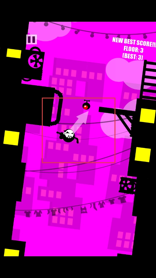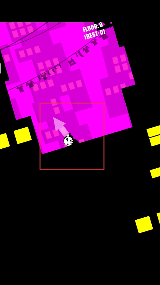 在粉色的场景里,通过点击屏幕来操控角色,让它朝着箭头指示的方向跳跃,避开途中的障碍,持续向更高楼层前进。