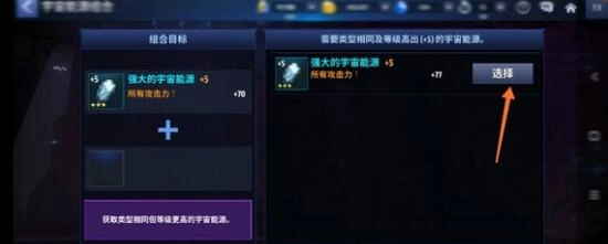 这个就是合成升星玩法,如果已经将宇宙能源X升级到+5品质,就可以把两个同类型的宇宙能源X组合起来,得到一个更高等级的宇宙能源X。需要说明的是,已经装备在角色身上的宇宙能源X也能参与组合,而且通过这种合成方式,最高可以将其等级提升到6星。