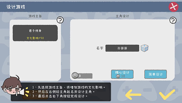 5、选择游戏主旨,将增加游戏的文化影响,然后在右侧给主角起名并设计主角,最后点击右下角【打勾】图标完成设计,