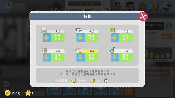12、我们还可以通过对【技能】中的剧情文案、游戏设计、游戏经济、程序开发、美术鉴赏、音乐鉴赏各项技能进行升级来提高游戏分数,