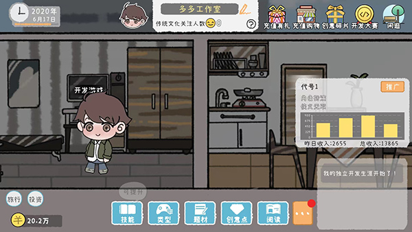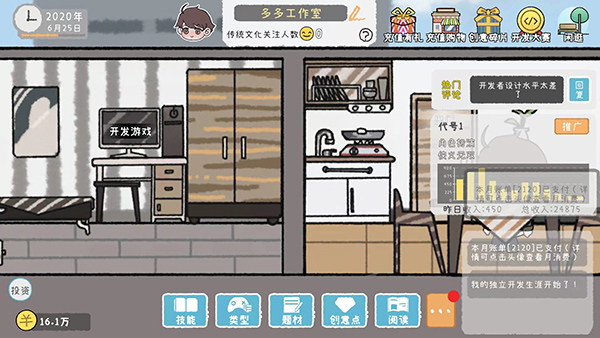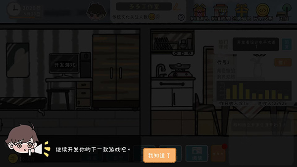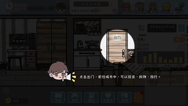 2、收益体验:右下角有剧情显示,玩家可以通过剧情知道自己创作的游戏的收益,和自己在日常生活中花掉的钱和挣到的钱。
