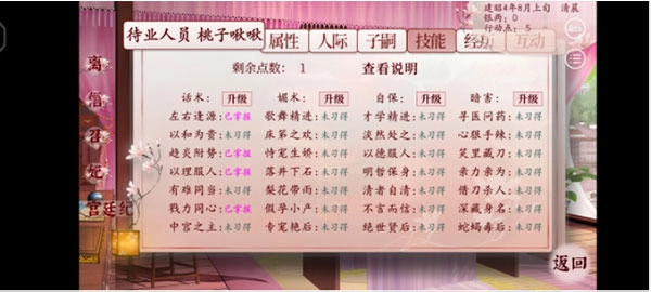 ④每次在宴会上受到太后夸奖,或是向皇上敬酒,都能获得3个技能点。