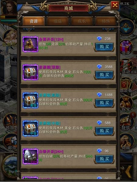 还可以在商城内直接购买增益效果或是直接购买资源箱快速获得资源。