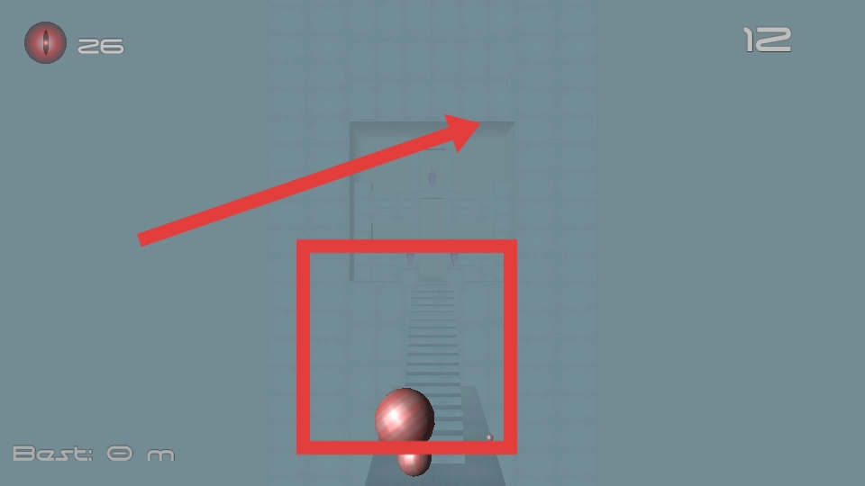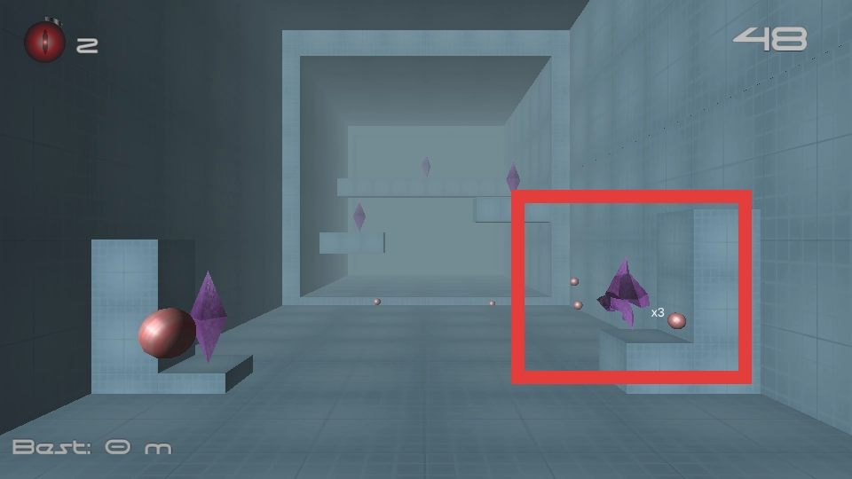 游戏里玩家要操控图中红框标出的红色球体在场景里移动,既要躲开障碍物,也要收集紫色晶体。