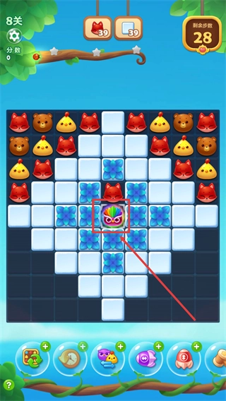 3、请在剩余的【28】步里,通过匹配棋盘上的动物来消除冰块;建议优先消除关键区域,这样能更快完成收集目标,从而推进关卡进度。