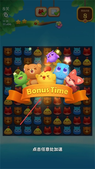 4、达成关卡目标后会进入【BonusTime】环节,点击界面任意位置可加速动画播放,从而快速领取奖励,提升游戏推进的效率。