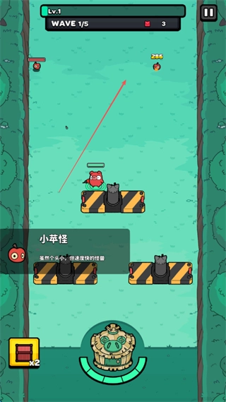 2、操控炮台攻击袭来的小苹怪,减少怪物数量,推进WAVE1/5的进度。