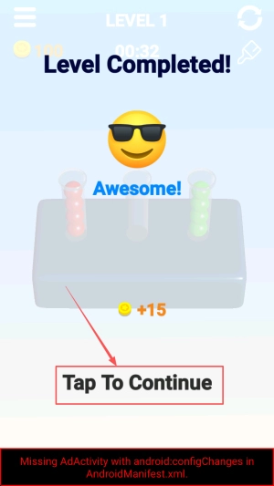 完成关卡的操作步骤:当出现“Level Completed”界面时,点击“Tap To Continue”按钮,即可领取15点奖励并进入下一个关卡。