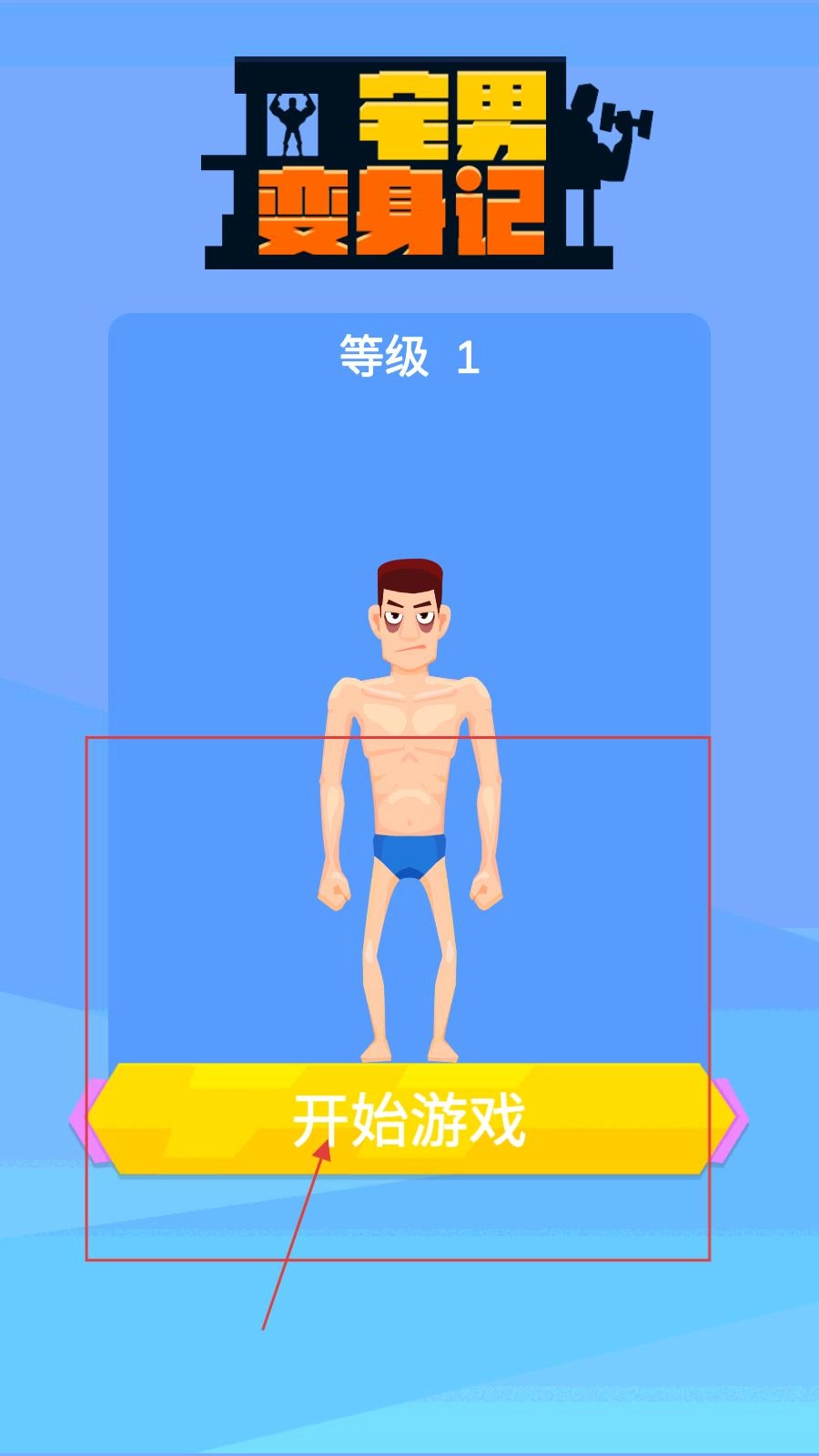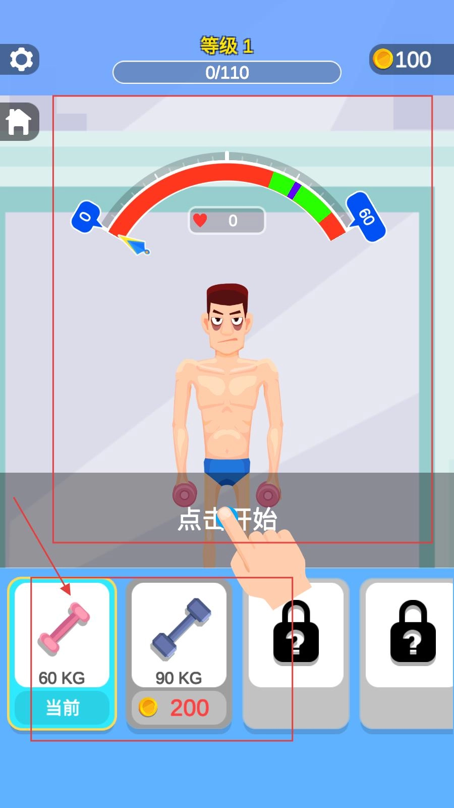 点击【开始游戏】即可进入等级1,此时你需要挑选合适的哑铃,再按照提示点击开始健身,以此来提升角色的肌肉值。