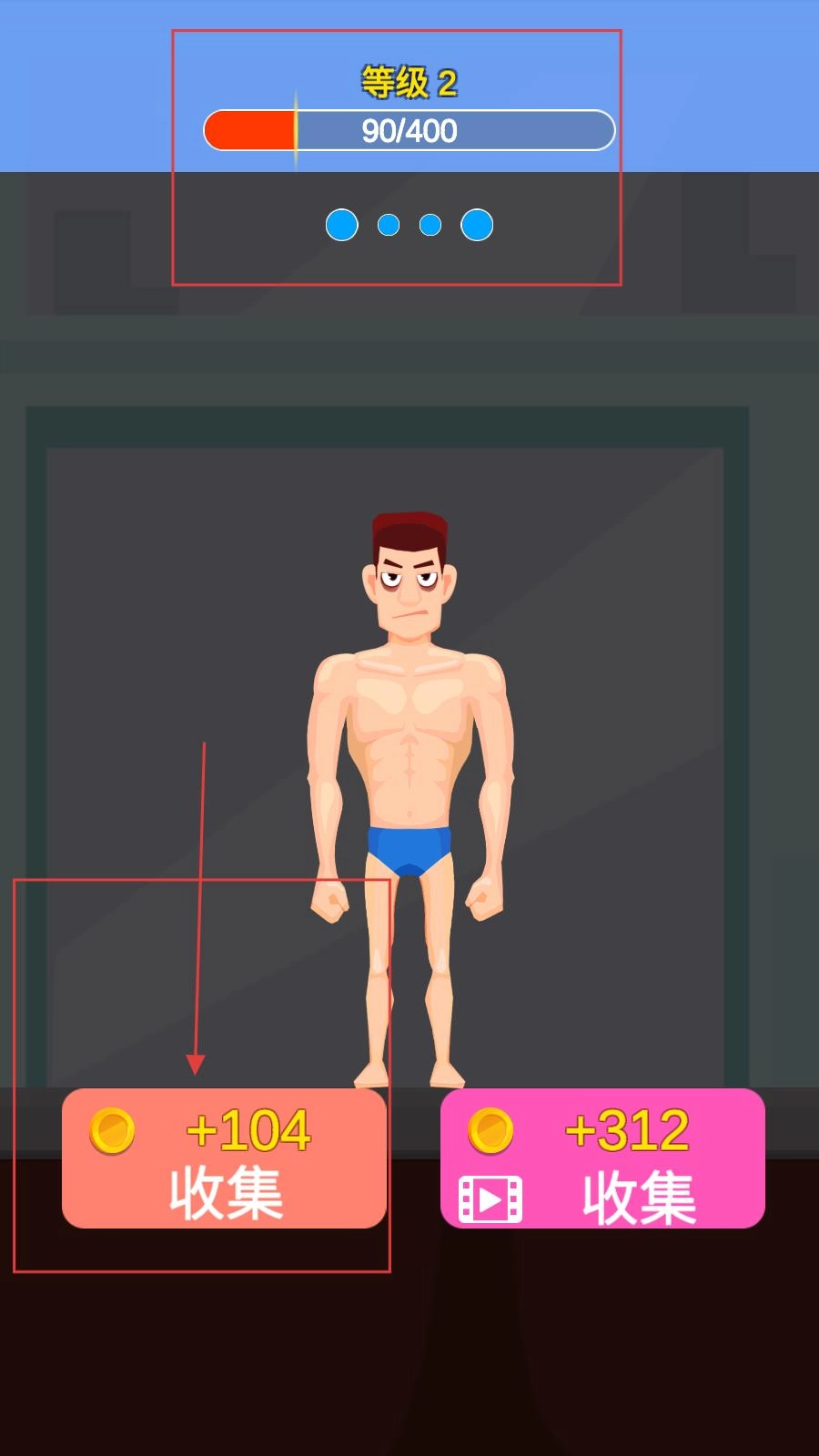 玩家等级提升至2级后,点击【收集】按钮领取金币,使用金币购置新装备,持续通过健身强化角色,推动养成进程。
