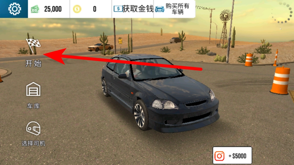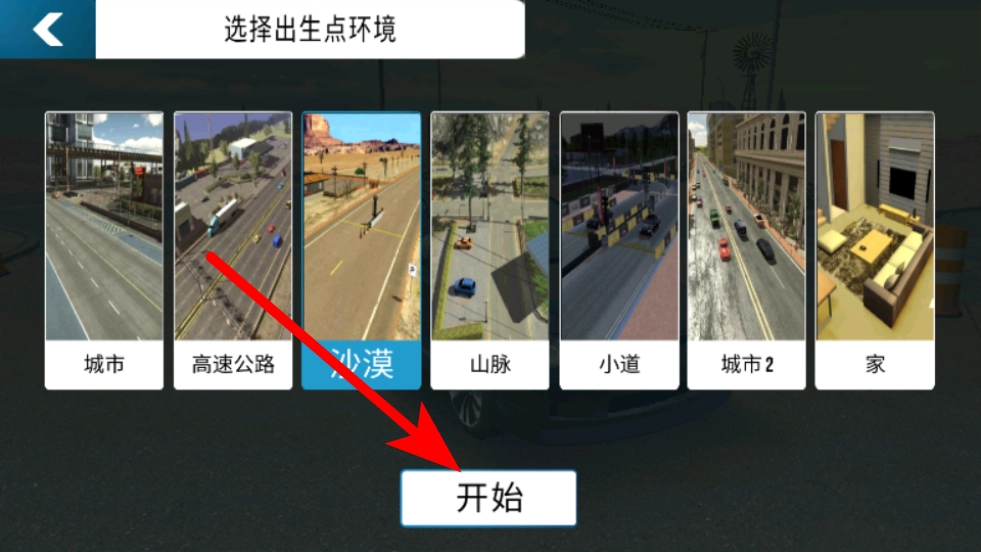 2、在环境选择界面挑选沙漠场景,然后点击下方的开始按钮,即可进入驾驶场景。