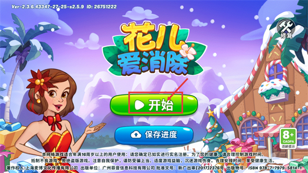 1、进入【花儿爱消除】后,先确认【8+-CADPA适龄提示】,点击【开始】进入游戏,记得通过【保存进度】功能留存当前的游戏进度。