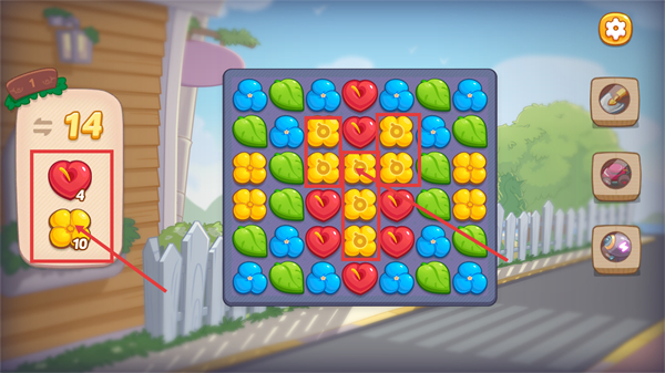 2、关卡内需达成【红心-4】和【黄花-10】的消除目标,优先连接同色元素,集中消除目标图案以推进当前关卡进度。