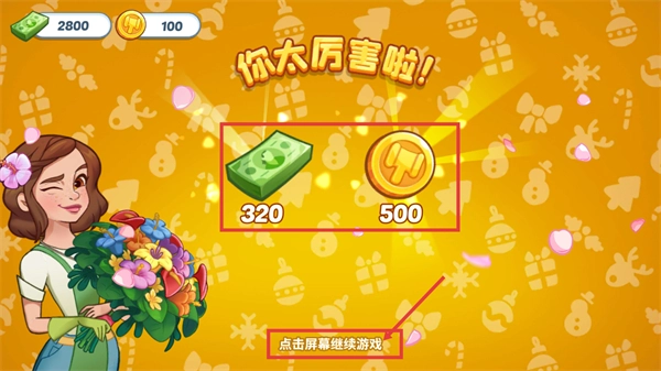 4、通关后可获取【320-金币】和【500-货币】奖励,点击屏幕继续游戏,积累这些资源助力后续关卡的推进。