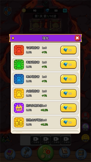 使用获取到的钻石,可以对弓箭塔、毒液塔、寒冰塔等各类防御塔的伤害能力进行强化,选择丰富多样,策略变化无穷。需要注意的是,战场上防御塔的部署位置数量有限,因此进行合理规划安排十分关键。