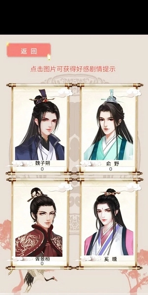在游戏中,玩家将沉浸于跌宕起伏的精彩剧情,邂逅四位风格迥异的男性角色——野心深藏的丞相、英气逼人的将军、才思敏捷的诗人与温润如玉的乐师。你将在他们之间周旋,谱写一段段浪漫有趣的故事,过程中还会遇到形形色色的人物与突发事件。