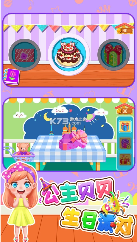 《公主贝贝生日派对》是一款专为儿童打造的益智游戏,玩家在游戏中能参与制作贺卡、烘焙蛋糕、互动游戏、趣味换装等一系列活动,让孩子们沉浸式体验一场欢乐派对,感兴趣的话就快来试试吧!
