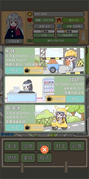 这是一款非常爽的富豪模拟人生游戏,虽然进入游戏玩家也需要白手起家做起,但是游戏内赚钱的路子很多而且难度并不大,玩家可以很容易的就成为富翁,成为富翁后玩家可以购买各种华丽的房屋,什么兰博基尼、法拉利等等在这里不值一提,还能与各种美少女培养感情当亲密度到达60以上还能与其结婚。